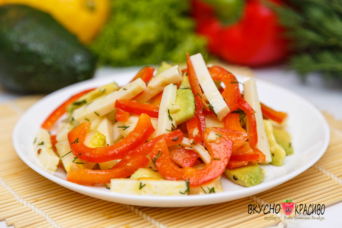 Авокадо вымыть, очистить, разрезать пополам, удалить косточку, мякоть нарезать дольками. Сразу же выжать из половинки лимона сок на авокадо.
