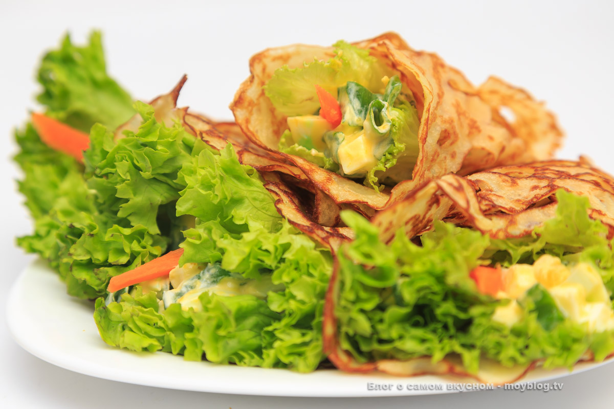 Решётчатые блины можно фаршировать несладкой начинкой, если перед эти положить её в листья салата.