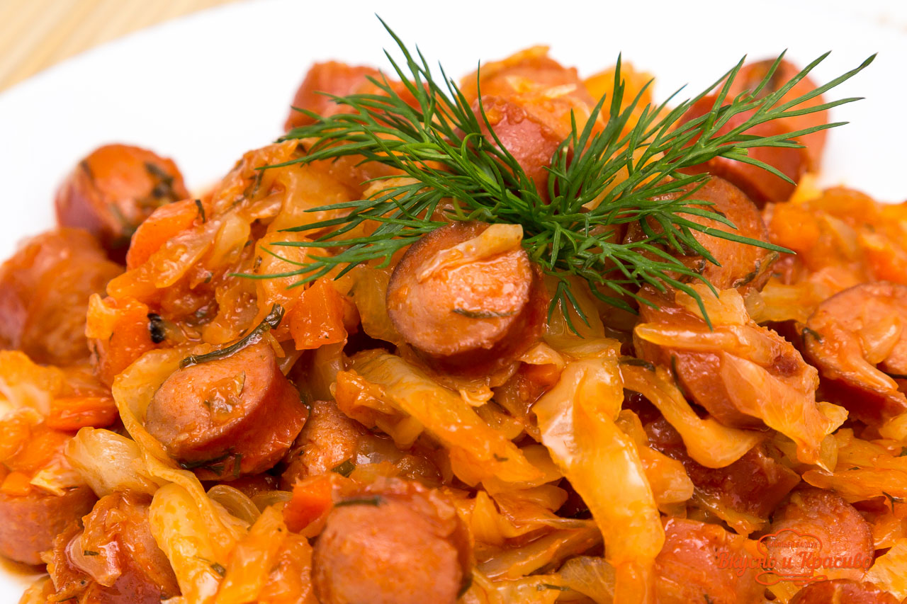 Капуста тушёная с сосисками готова!