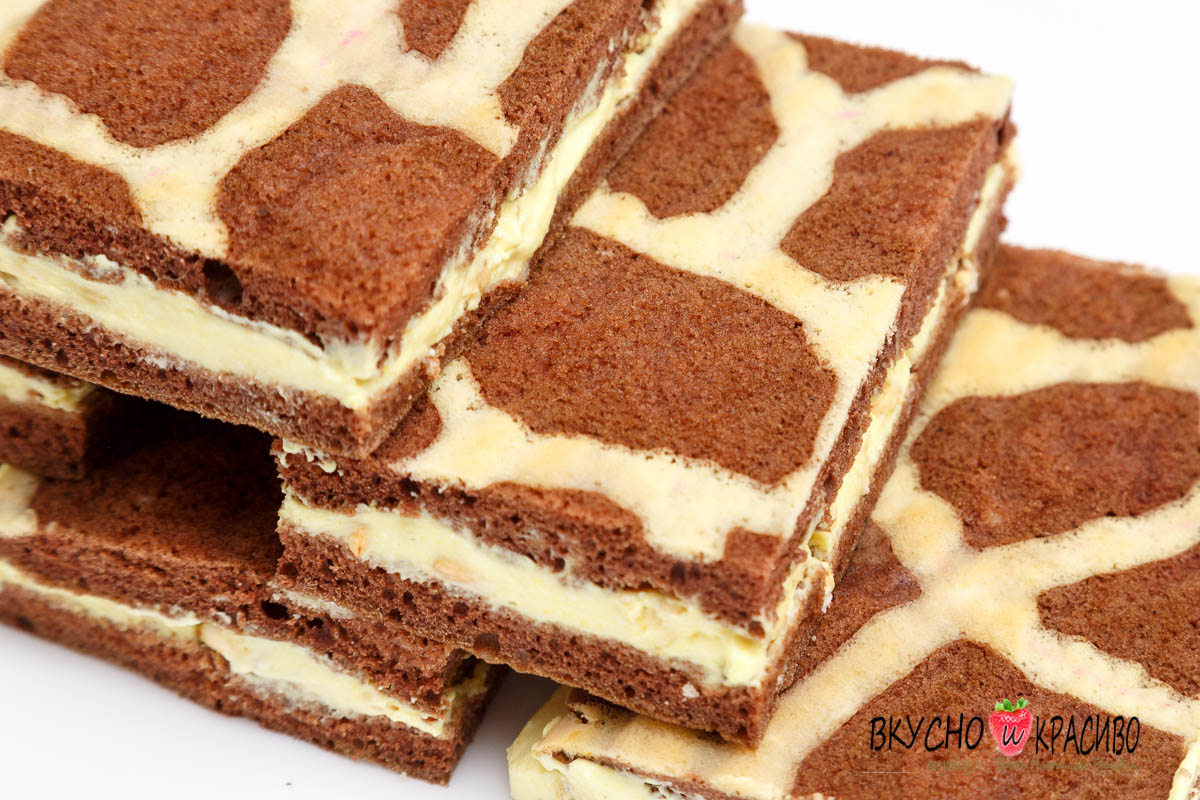 И, в итоге вот такая вкусняшка — нежное пирожное Жираф. Своё название выпечка получила из-за характерного симпатичного узора. С орнаментом можно пофантазировать на свой вкус, проявив свой художественный талант или, наоборот, упростив рисунок, ведь главное здесь идея. Также можно поэкспериментировать и с кремом. Я сделала простую, но очень вкусную творожную прослойку, которую при желании можно заменить на вареную сгущенку, заварной крем, варенье, джем…