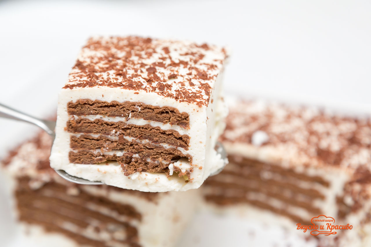 Когда торт застынет, то по поверхности проступят очертания печенек и по ним очень удобно нарезать торт на порции — пирожные.