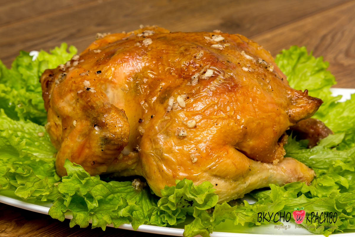 Этого времени как раз хватает для того чтобы курочка обрела золотистый наряд. Если, вы хотите более насыщенный цвет корочки, то оставьте курочку, ещё на 10 — 15 минут.