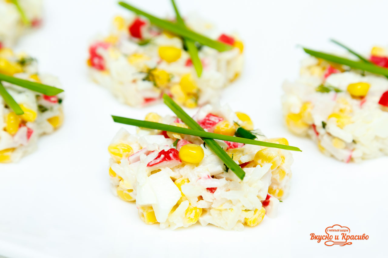 Кукурузой и крабовыми палочками! Дело в том, что в процессе перемешивания, соединения с майонезом, ингредиенты в салате, теряют свою красочность.
