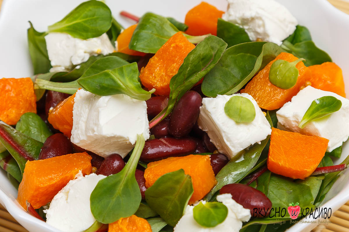 Выкладываем в большой салатник мелкие листья салата. Если нет мелких, просто нарвите на мелкие кусочки любой салат. Полейте соусом. Сверху листьев салата выложите фасоль, тыкву. Аккуратно перемешайте.
