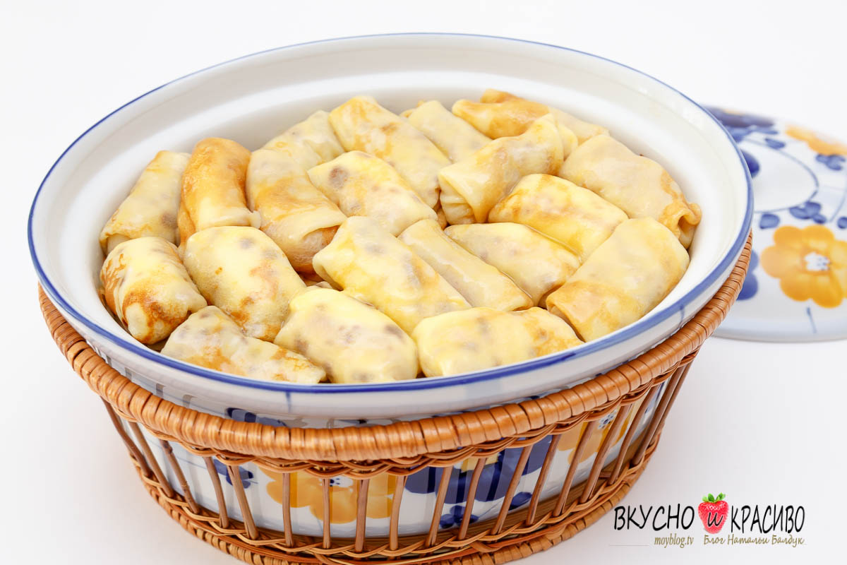 Но, нужды в этом нет, и бояться, что блины будут недопечёнными не стоит. Начинённые блинчики — налистники выкладываются в толстостенную жаропрочную посудину слоями. Каждый слой промазывается топлёным сливочным маслом и пересыпается сахаром. Форму с налистниками, убирают в духовку на 1 — 3 часа дозревать. Время и температура дозревания, напрямую зависит от начинки.