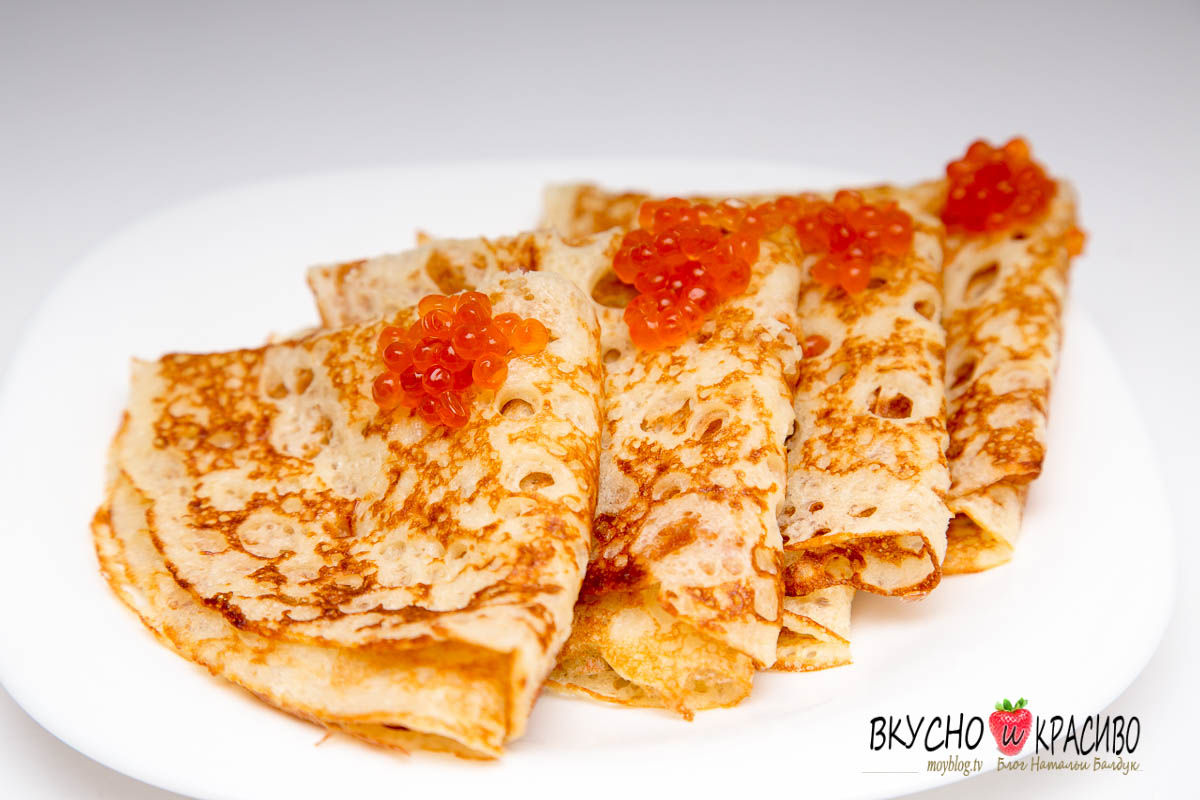 Ну и конечно же, как же без них — это дрожжевые кружевные, дырявые блинчики. Я их называю царскими. Эти блины с иным вкусом, они больше походят на нежное хлебное изделие. Как раз к красной икорке. Такие блинчики, я пеку, когда мы всей семьёй ездим к друзьям в баньку. Напаришься до полусмерти, окунёшься в ледяную водичку и за стол! А на столе, целая гора царских с икрой, и прохладный пивасик.