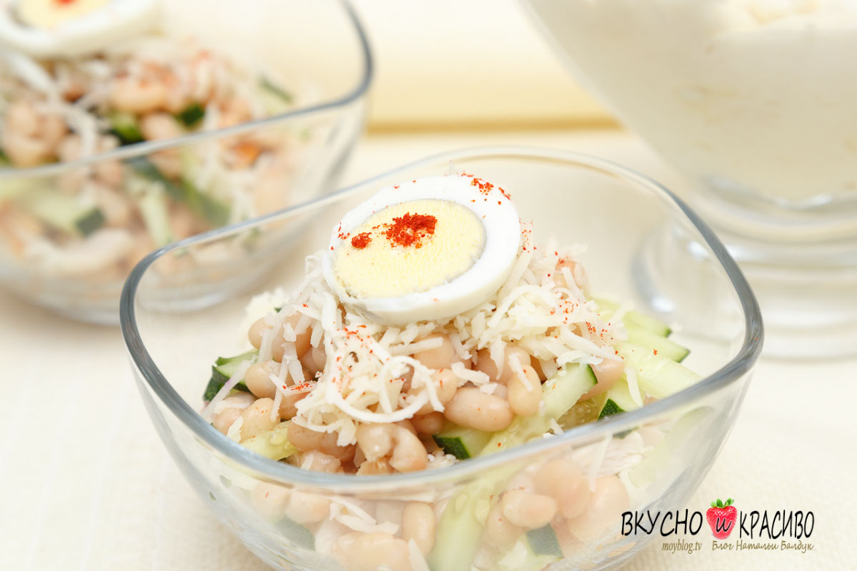 Такой салат лучше всего подавать порциями, ведь именно в такой подаче в нем наилучшим образом гармонируют все продукты. Нежная сливочная фасоль, дымок копченого мяса и свежесть огурца словно поют в унисон: «Съешь меня!»