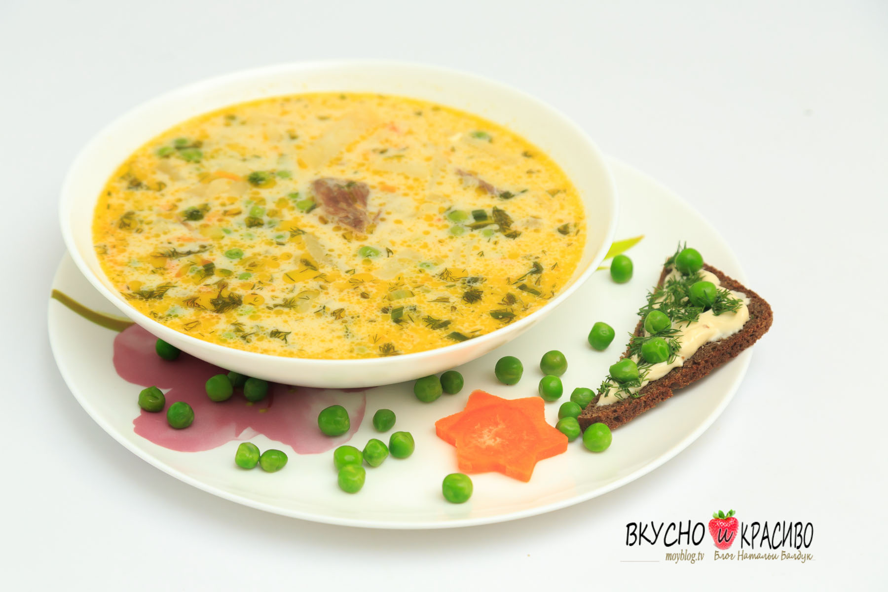 Благодаря плавленому сыру добавленному в процессе приготовления, суп приобретает сливочный вкус, цвет и аромат набирает от зелёного горошка.