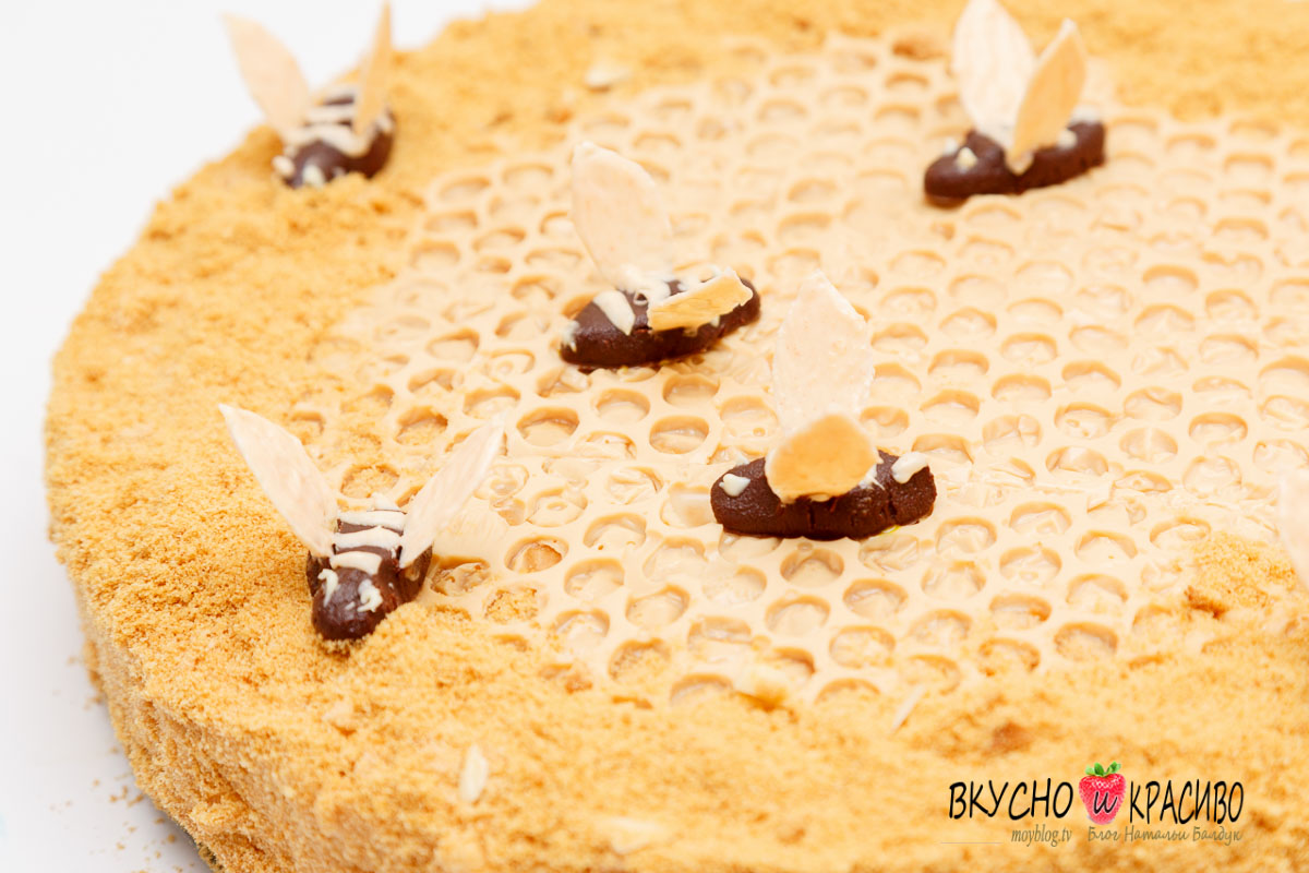 Украшаем пчёлками и листиками мяты. У меня мяты не было. А так с зеленью тортик выглядит ещё более нарядным и праздничным.